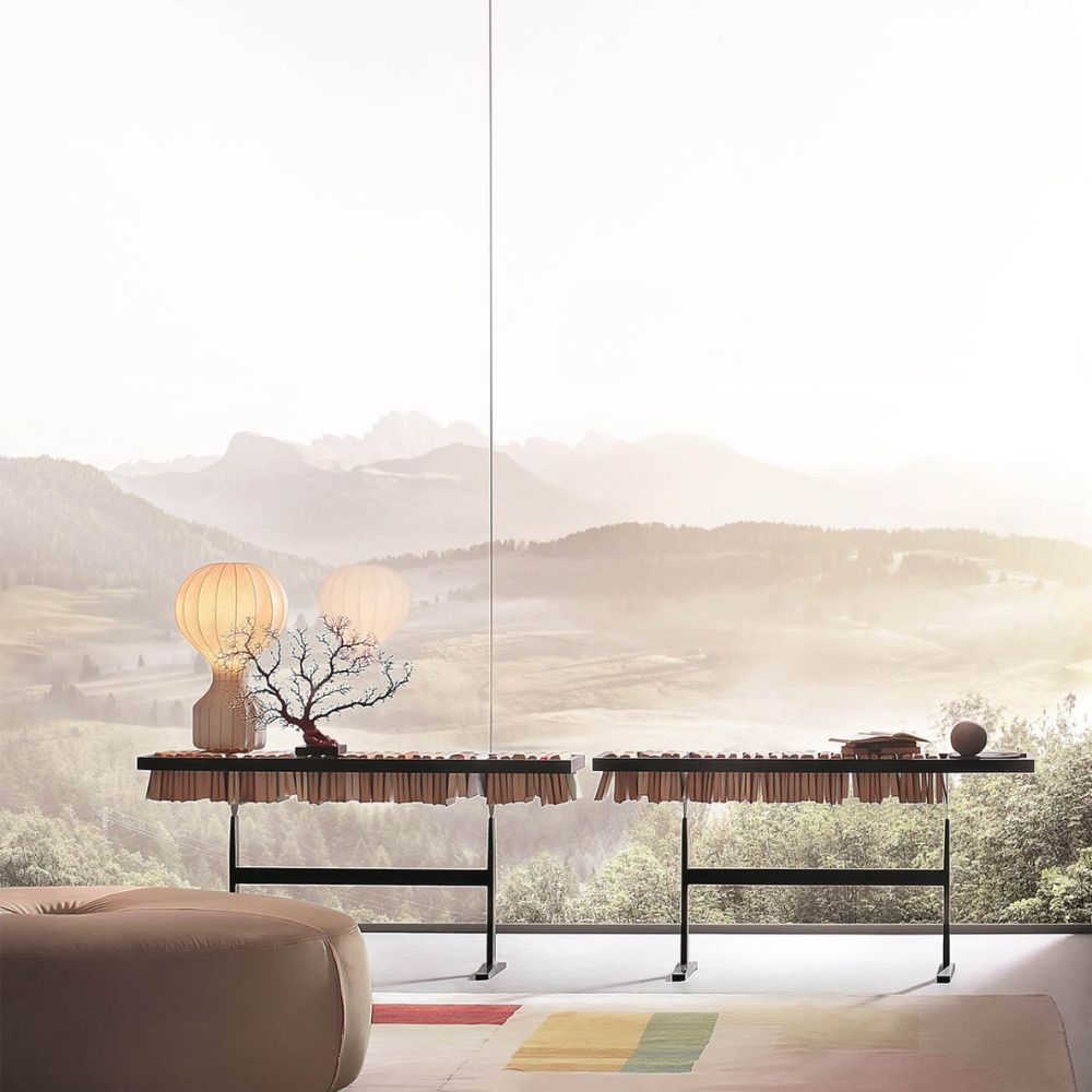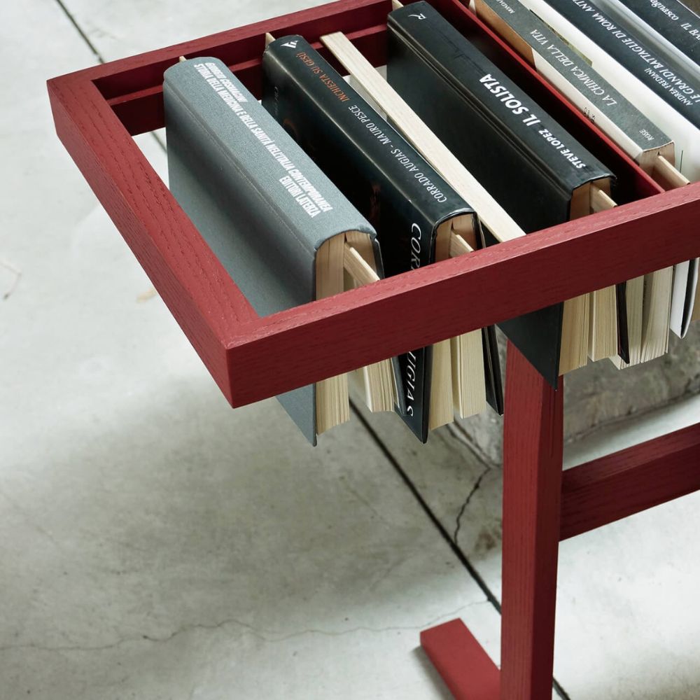 Booken ist eine Stilübung, die das Konzept des Bücherschranks auf ungewöhnliche Art interpretiert. Das Möbel hat keine starken Ständer, sondern zwei Holzbeine, die durch einen Querbalken verstärkt sind. Im oberen Teil sind zwei Schienen eingebaut, in denen Holzstäbe hin- und herfahren, die die Aufgabe von Buchzeeichen übernehmen. Bei Booken - erhältlich in Sattrot und zarterem Schwarz - werden die Bücher aufgehängt. Das Möbel wurde als frei stehender Einrichtungsgegenstand entworfen, wird aber auch als Lösung für die Wand hergestellt: Ein Regal auf Schienen, in dem die Bücher hängend schweben.