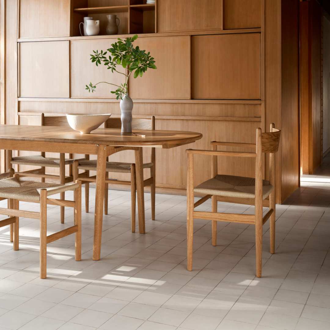 Handwerkskunst und Liebe zum Detail sind im CH37-Esszimmerstuhl von Hans J. Wegner zu sehen. Der saubere und schlichte Stuhl von 1962 ist so bequem wie schön anzusehen. Der CH36 Esszimmerstuhl von Hans J. Wegner wurde mit viel Liebe zum Detail in einem einfachen und funktionalen Design gefertigt. Dieser Entwurf von 1962 demonstriert den Einfluss der amerikanischen Shaker-Möbelprinzipien und der Kunstfertigkeit auf Wegners Arbeit.
