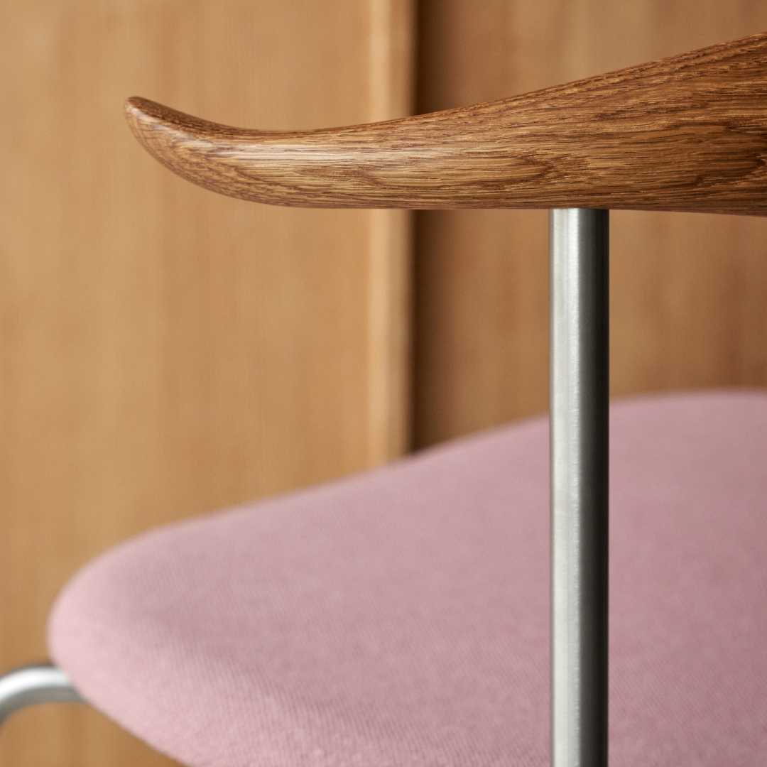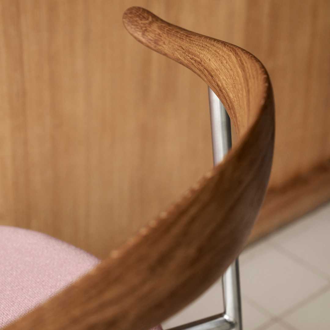 Der CH88T Stuhl ist ein schönes Beispiel für Hans J. Wegners experimentellen Charakter - eine kunstvolle Verschmelzung von Holz und Stahl. Der vielseitige und stapelbare CH88T Stuhl verkörpert Wegners spielerische Herangehensweise an Design und Materialien. Obwohl Hans J. Wegner im Laufe seiner Karriere für seine Arbeit mit Holz bekannt war, erkundete er häufig die Grenzen und das Potenzial anderer Materialien. Der sorgfältig überlegte CH88T-Esszimmerstuhl ist ein solches Beispiel. Das Design wurde ursprünglich von Wegner als Prototyp mit farbigen Beinen entwickelt. Es wurde 1955 auf der internationalen Helsingborg-Ausstellung in Schweden gezeigt. Jahrzehnte später nahm Carl Hansen & Søn den Stuhl anlässlich des 100. Geburtstags von Wegner 2014 in Betrieb. Der CH88T ist vielseitig, elegant und funktional. Das praktische, stapelbare Design fügt sich nahtlos in Holz und Industriestahl ein und zeigt, dass Wegner es versteht, minimalistischen Formen Weichheit zu verleihen. Der Stahlrahmen trägt einen ovalen Holzsitz und eine dampfgebogene Rückenlehne mit elegant nach oben gerichteten Enden, die einen natürlichen Ruheplatz für die Unterarme bilden.