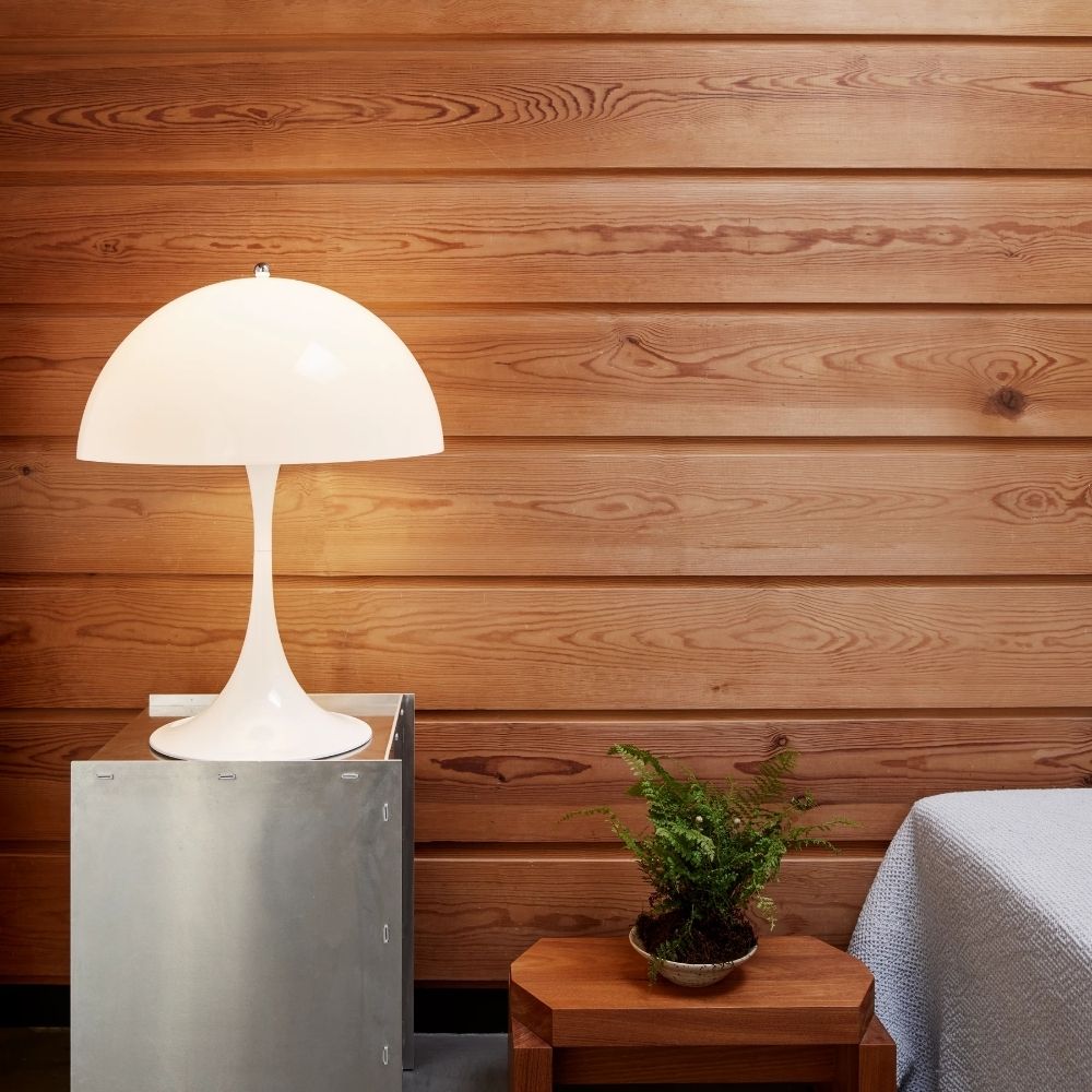 Die 1971 entworfene Leuchte Panthella gilt inzwischen als einer der bedeutendsten Entwürfe von Verner Panton. Die leicht wiedererkennbare, weiche, organische Form der Tischleuchte in Kombination mit der opalweißen Farbe ist nicht nur schön, sondern auch funktionell, da sie ein angenehm diffuses und reflektiertes Licht spendet. Der halbkugelförmige obere Schirm lenkt das Licht nach unten, wo es von dem trompetenförmigen Fuß reflektiert wird. Die Panthella 400 Tischleuchte ist mit ihrer opalweißen Farbgebung und einem Schirmdurchmesser von 400 mm eine beliebte Wahl.