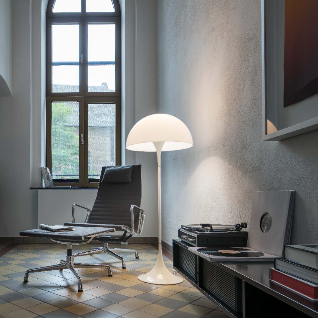 Die 1971 entworfene Leuchte Panthella gilt inzwischen als einer der bedeutendsten Entwürfe von Verner Panton. Die leicht wiedererkennbare, weiche, organische Form der Tischleuchte in Kombination mit der opalweißen Farbe ist nicht nur schön, sondern auch funktionell, da sie ein angenehm diffuses und reflektiertes Licht spendet. Der halbkugelförmige obere Schirm lenkt das Licht nach unten, wo es von dem trompetenförmigen Fuß reflektiert wird. Die Panthella 400 Tischleuchte ist mit ihrer opalweißen Farbgebung und einem Schirmdurchmesser von 400 mm eine beliebte Wahl.