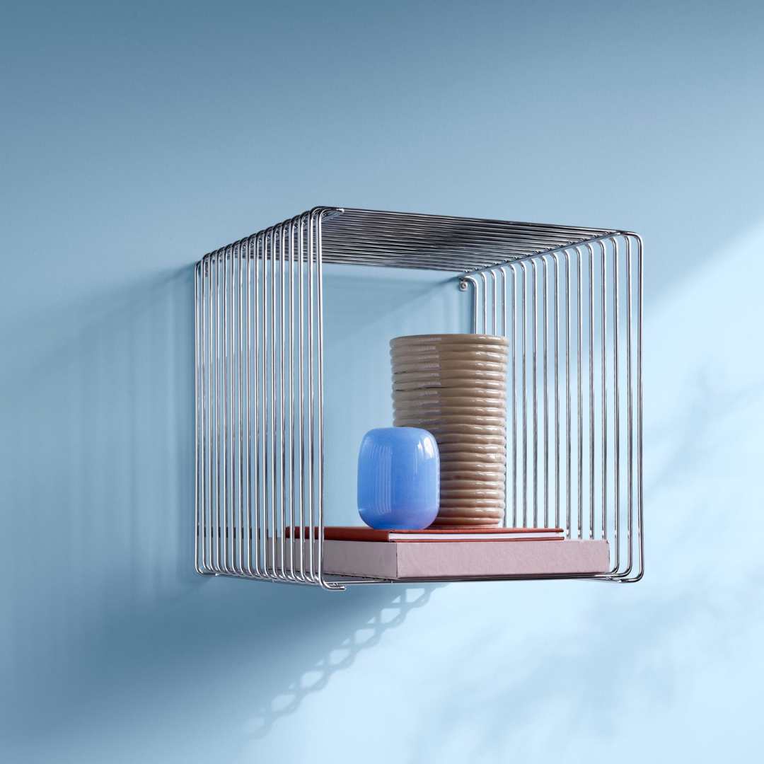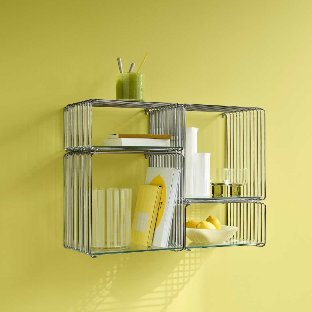 Das Panton Wire Drahtregal kann neben einem Bett oder Sofa aufgestellt, als Raumteiler genutzt oder wie ein schwebendes Regal an die Wand gehängt werden. Die Panton Wire Module können unbegrenzt miteinander kombiniert und überall verwendet werden: in der Wohnung, im Laden, in der Bibliothek, im Badezimmer…