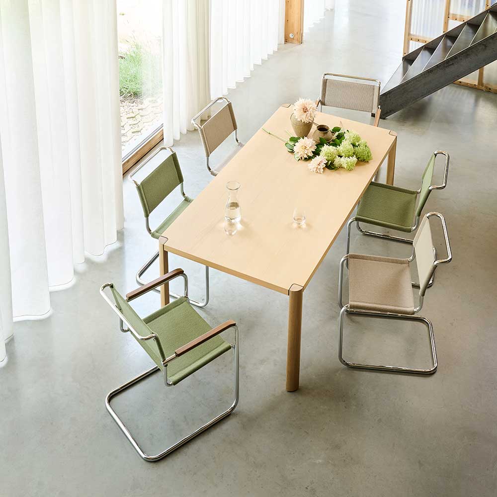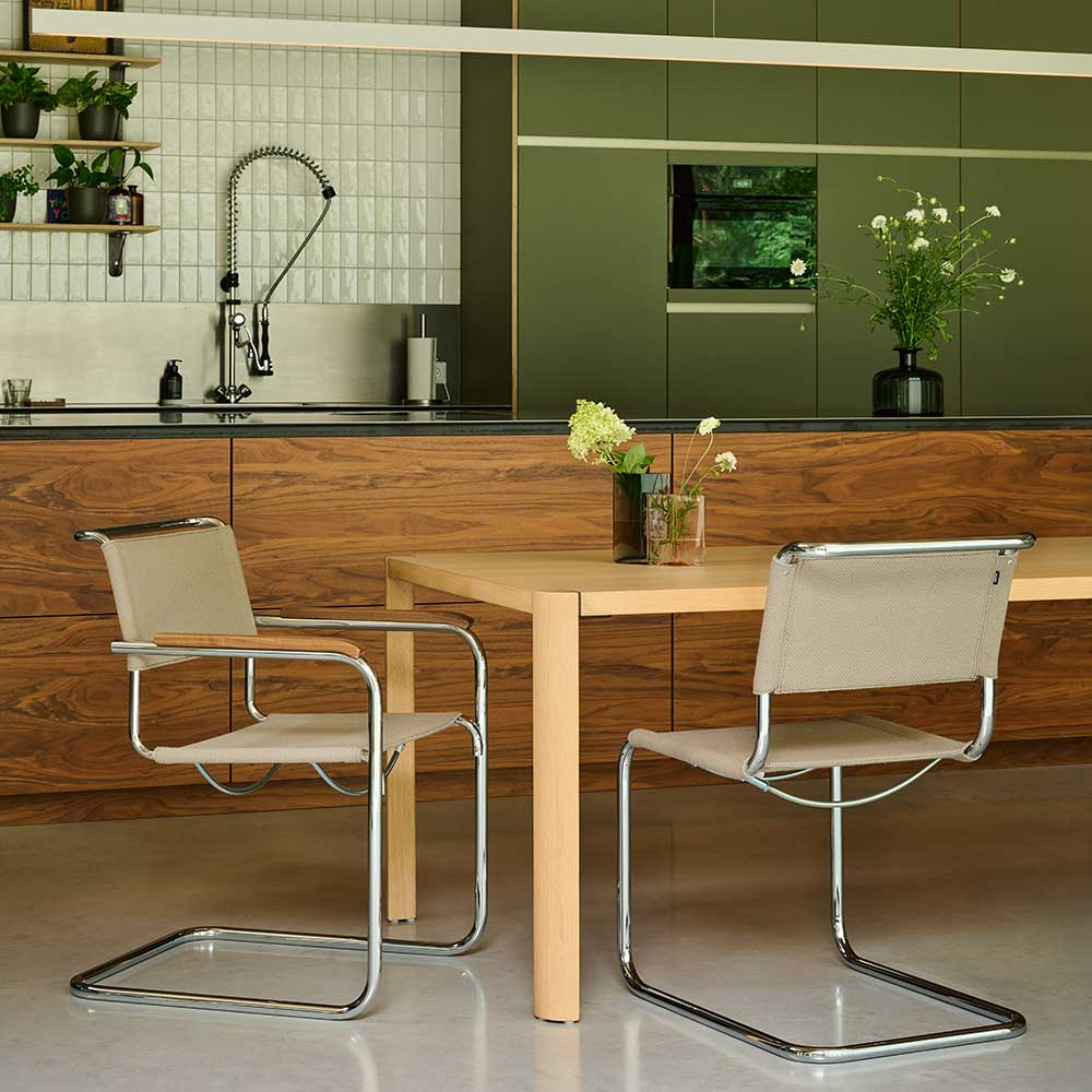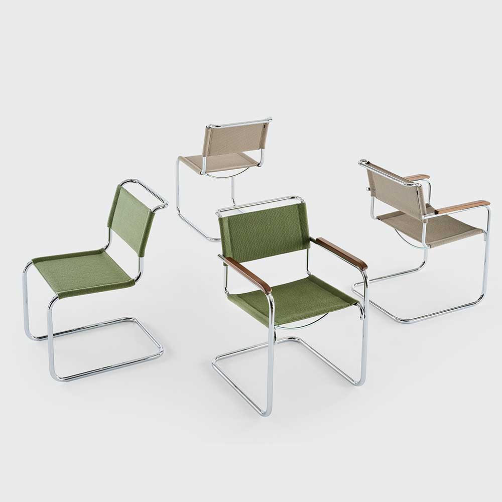 Mit der neuen Stoffbespannung bleiben der S 33 V „Soft“ und die Variante mit Armlehnen S 34 V „Soft“ formal ihrer Herkunft verpflichtet und öffnen sich zugleich neuen Kontexten. Die fein abgestimmten Proportionen und die kubische Form des Ursprungsentwurfs bleiben erhalten, während die textile Oberfläche eine „plastische Visualisierung des Komforts“ ermöglicht, wie Creative Director Norbert Ruf es formuliert. Der S 33/S 34 V „Soft“ zeichnet sich durch eine wohnliche Optik bei gleichzeitig erhöhtem Sitzkomfort aus. Er kann optimal am Esstisch, am Schreibtisch oder als Beistellstuhl im Schlaf- oder Gästezimmer verwendet werden. Dank der Möglichkeit, den Stoff individuell auf Material- und Farbkonzepte abzustimmen, fügt sich das wandelbare Möbel in verschiedenste Interieurs ein. So kann es sowohl in privaten Wohnräumen als auch im Objektbereich eingesetzt werden.
