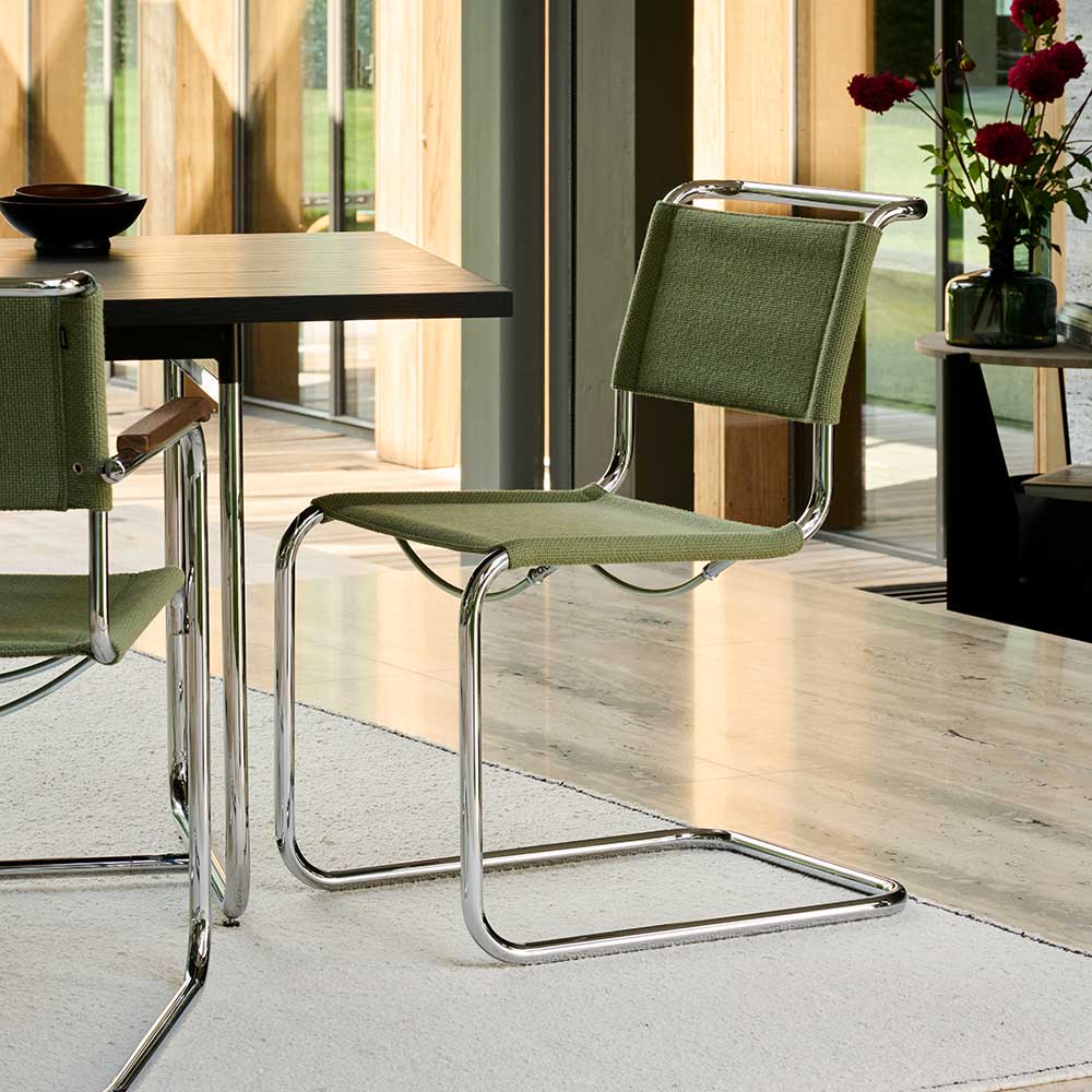 Mit der neuen Stoffbespannung bleiben der S 33 V „Soft“ und die Variante mit Armlehnen S 34 V „Soft“ formal ihrer Herkunft verpflichtet und öffnen sich zugleich neuen Kontexten. Die fein abgestimmten Proportionen und die kubische Form des Ursprungsentwurfs bleiben erhalten, während die textile Oberfläche eine „plastische Visualisierung des Komforts“ ermöglicht, wie Creative Director Norbert Ruf es formuliert. Der S 33/S 34 V „Soft“ zeichnet sich durch eine wohnliche Optik bei gleichzeitig erhöhtem Sitzkomfort aus. Er kann optimal am Esstisch, am Schreibtisch oder als Beistellstuhl im Schlaf- oder Gästezimmer verwendet werden. Dank der Möglichkeit, den Stoff individuell auf Material- und Farbkonzepte abzustimmen, fügt sich das wandelbare Möbel in verschiedenste Interieurs ein. So kann es sowohl in privaten Wohnräumen als auch im Objektbereich eingesetzt werden.