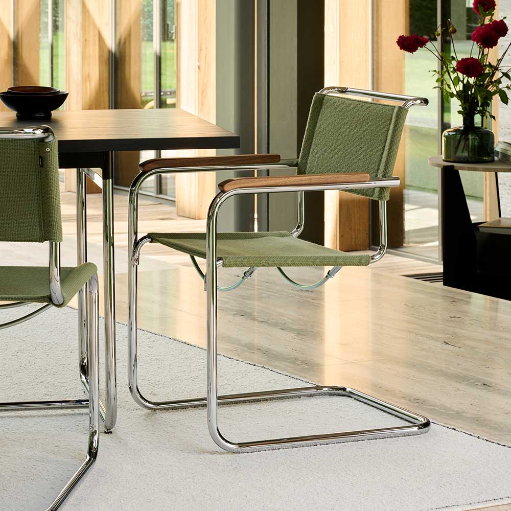 Mit der neuen Stoffbespannung bleiben der S 33 V „Soft“ und die Variante mit Armlehnen S 34 V „Soft“ formal ihrer Herkunft verpflichtet und öffnen sich zugleich neuen Kontexten. Die fein abgestimmten Proportionen und die kubische Form des Ursprungsentwurfs bleiben erhalten, während die textile Oberfläche eine „plastische Visualisierung des Komforts“ ermöglicht, wie Creative Director Norbert Ruf es formuliert. Der S 33/S 34 V „Soft“ zeichnet sich durch eine wohnliche Optik bei gleichzeitig erhöhtem Sitzkomfort aus. Er kann optimal am Esstisch, am Schreibtisch oder als Beistellstuhl im Schlaf- oder Gästezimmer verwendet werden. Dank der Möglichkeit, den Stoff individuell auf Material- und Farbkonzepte abzustimmen, fügt sich das wandelbare Möbel in verschiedenste Interieurs ein. So kann es sowohl in privaten Wohnräumen als auch im Objektbereich eingesetzt werden.